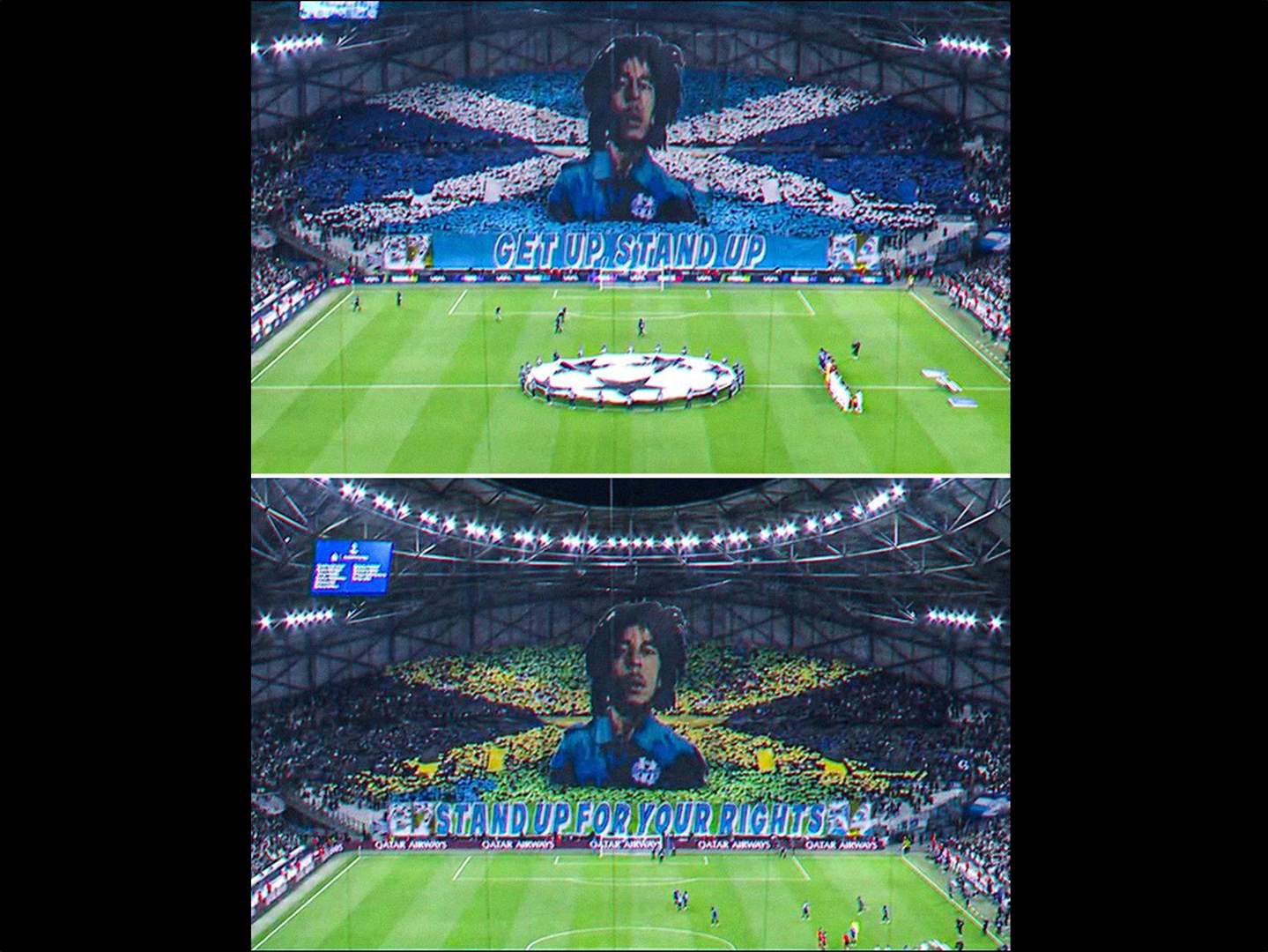 قبل انطلاق مباراة مارسيليا أمام أتالانتا في دوري أبطال أوروبا، رفعت جماهير النادي الفرنسي في مدرّج الجنوب “فيراج سود”، تيفو ضخم يُجسِّد أسطورة الريغي بوب مارلي، مع لافتات متتابعة تضمّنت العبارة الشهيرة: “Get up, stand up, stand up for your rights”.