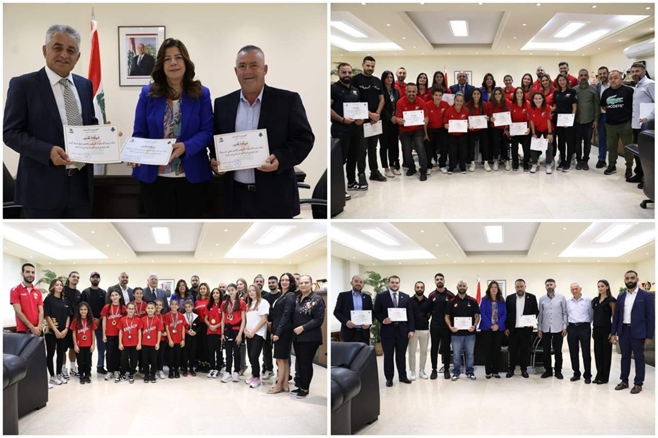“انطلاقاً من ايمانها بأهمية تكريم الأبطال، وإبراز النماذج المتميزة منهم لتعزيز الهوية والانتماء، والتنافس الإيجابي، وغرس القيم الإيجابية، والشعور بالتقدير، ودعم المواهب الشابة، وتقدير الجهود التي تبذلها الاتحادات واللجان وادارييها ومدربيها، كرّمت وزيرة الشباب والرياضة الدكتورة نورا بايراقدريان، عدداً من الأبطال ممن أحرزوا ميداليات وحققوا انجازات رياضية خارجية على مستوى المراكز الثلاثة الأولى.